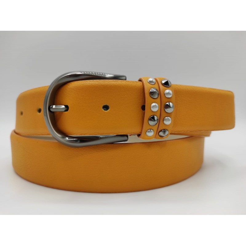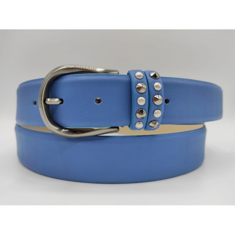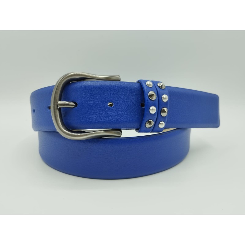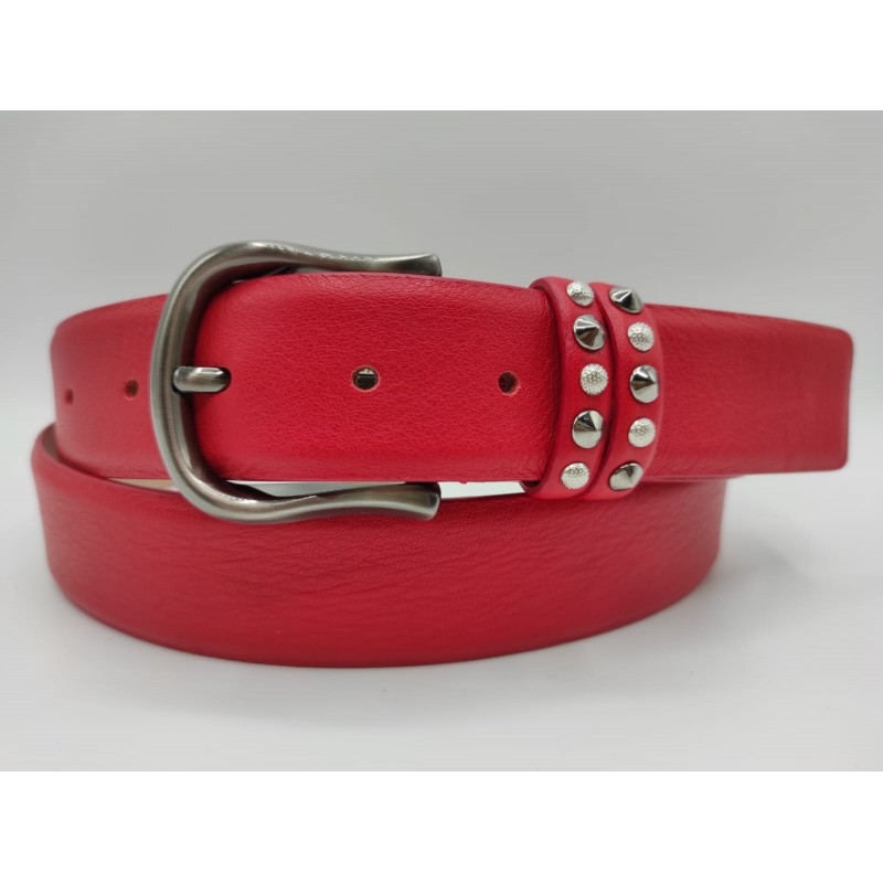 Modischer Gürtel aus echtem Leder. Auf der Doppelschlaufe befinden sich verschiedene Nieten die von Hand eingefügt wurden.