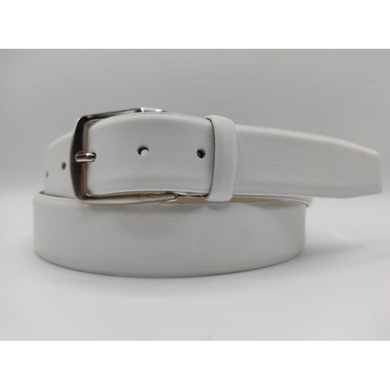 Elegant sporty belt made of genuine leather with shiny nickel buckle.