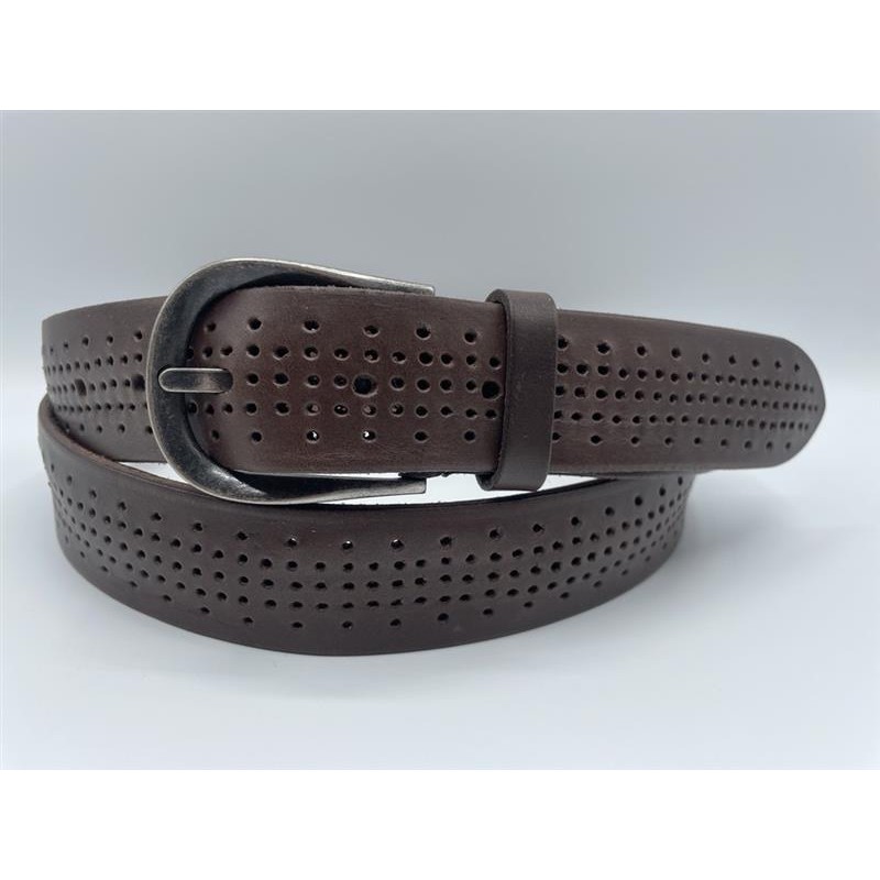 Fashionable sporty belt made of real perforated leather and a metal buckle in antique nickel color.