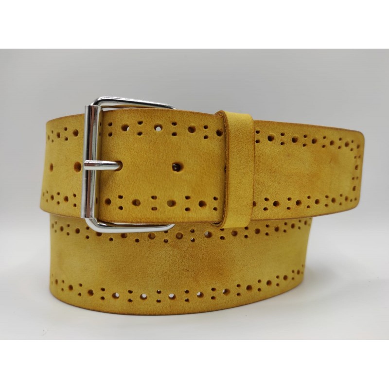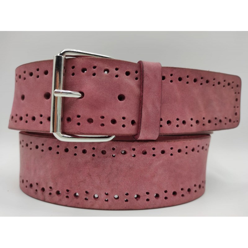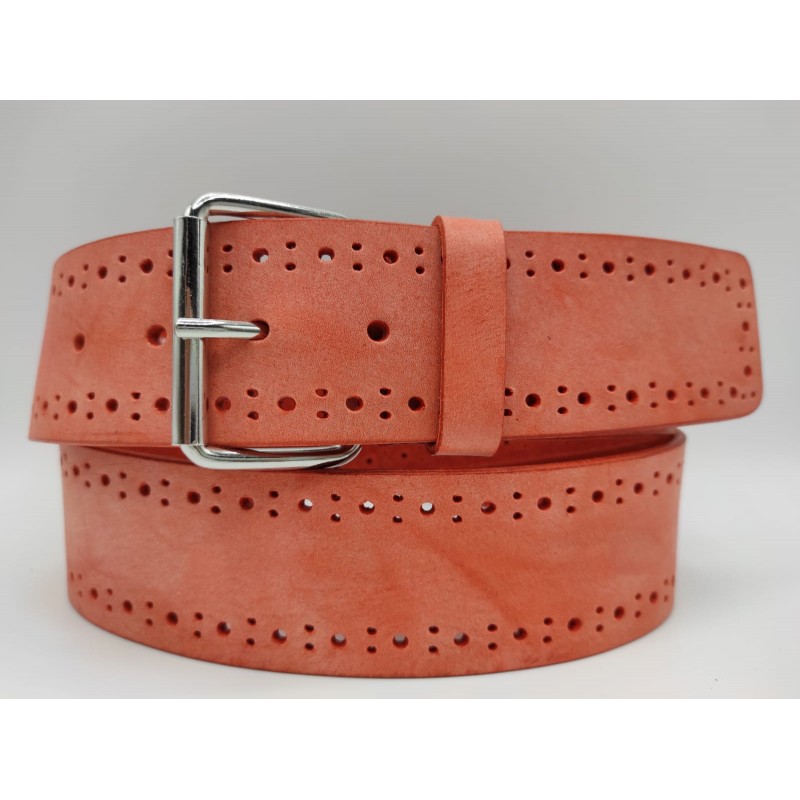 Fashionable wide belt, made of genuine leather and a hole pattern. Stylish metal roller buckle with a shiny finish.