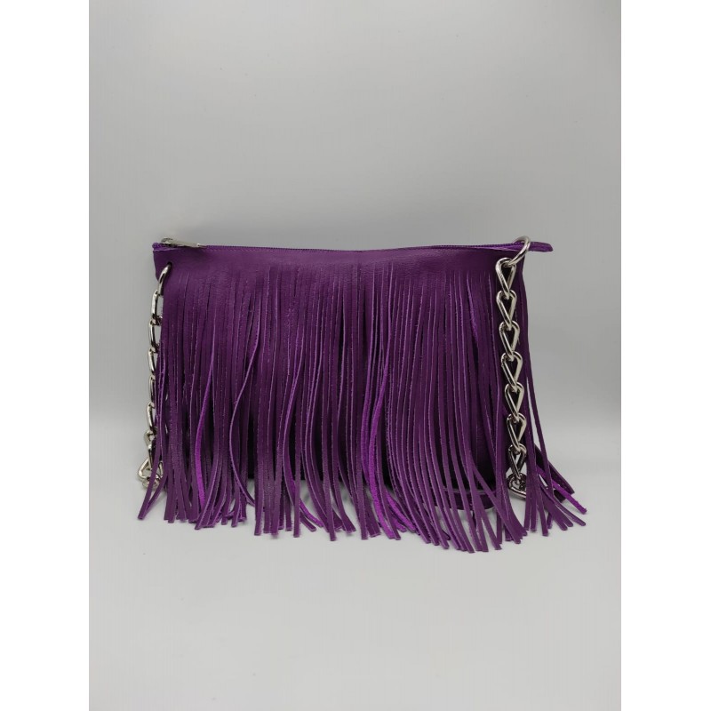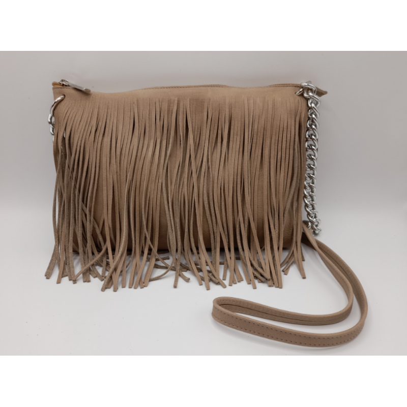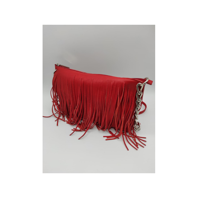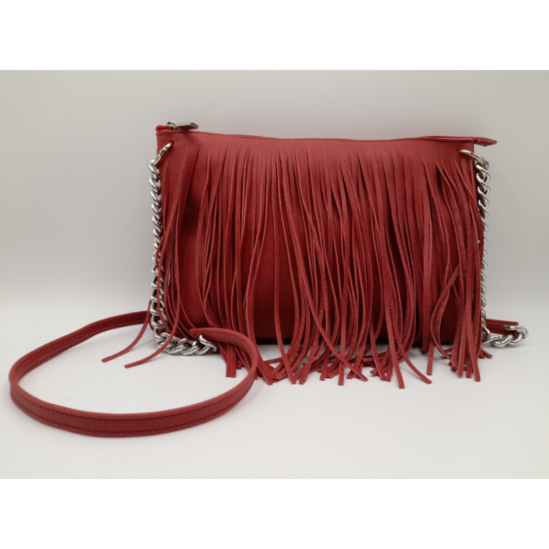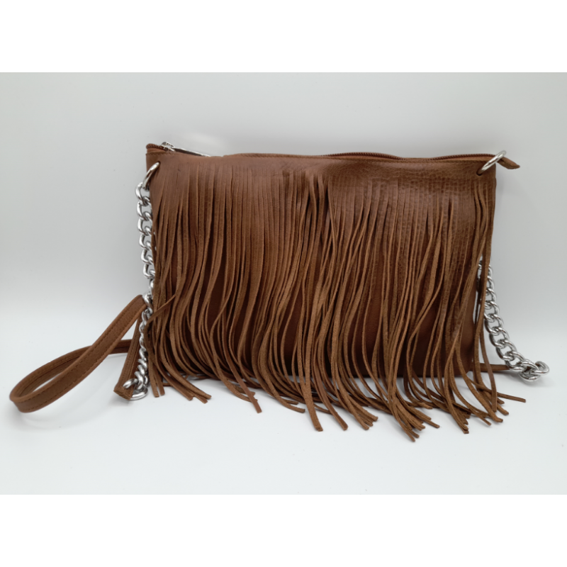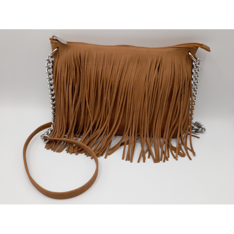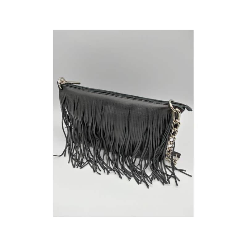Pratica borsa in vera pelle con frange e tracolla in metallo e pelle.
