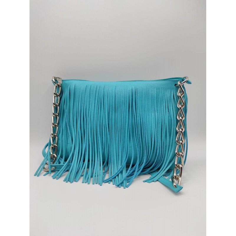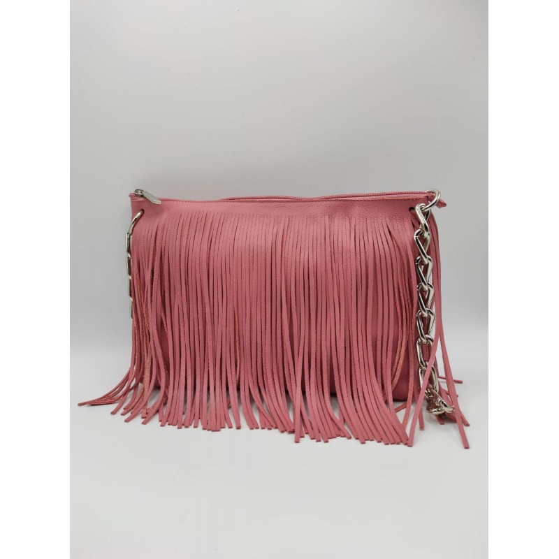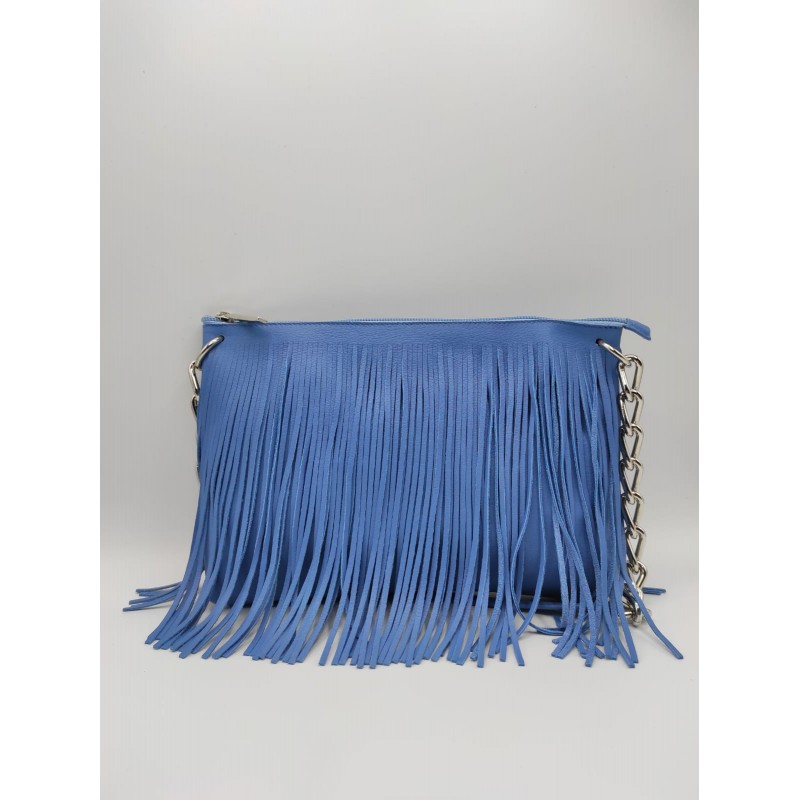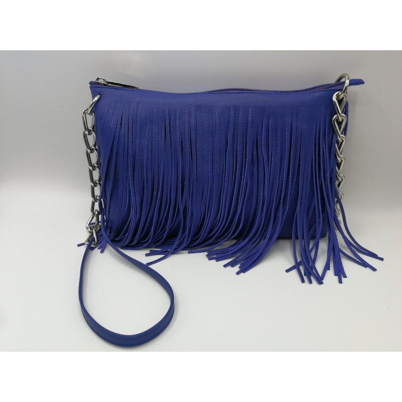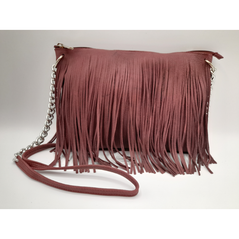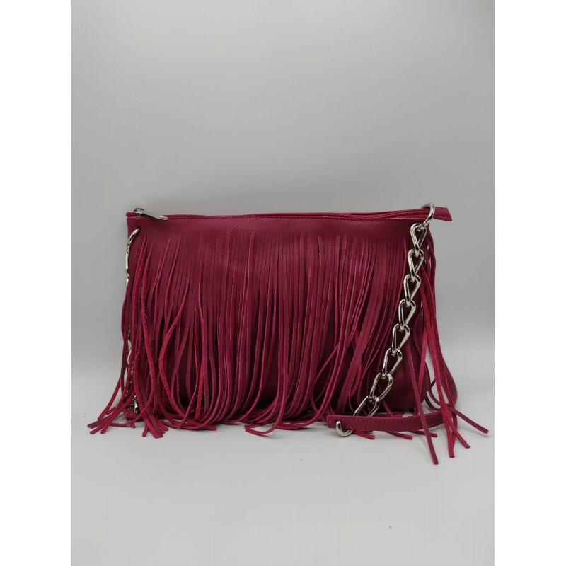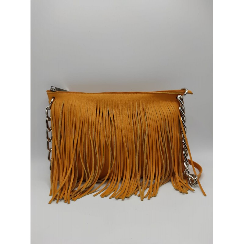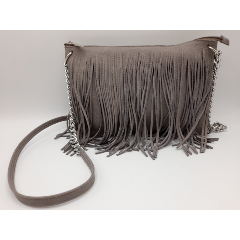 Pratica borsa in vera pelle con frange e tracolla in metallo e pelle.