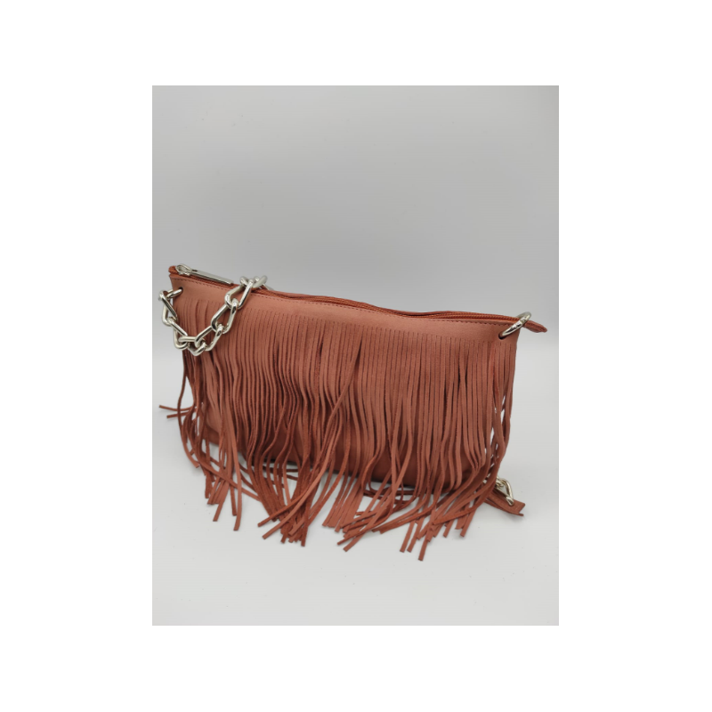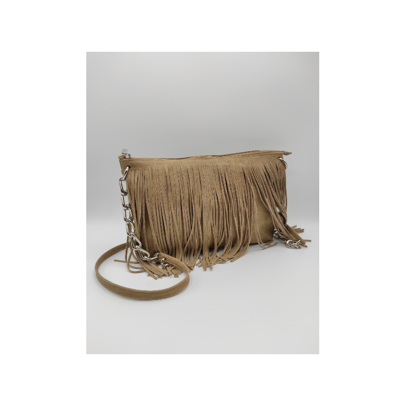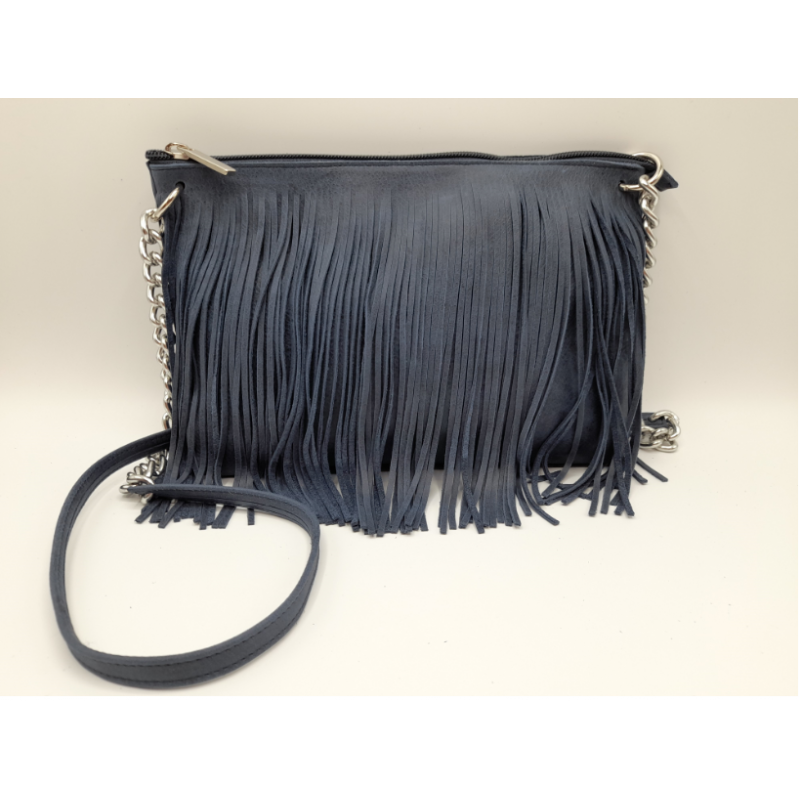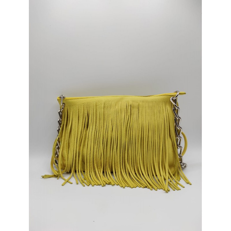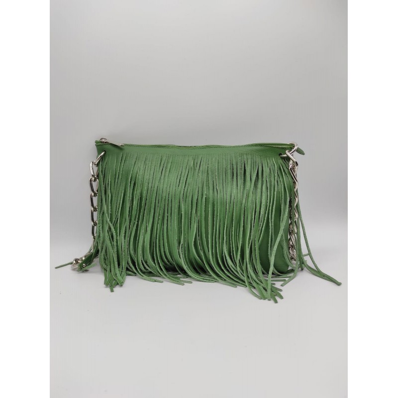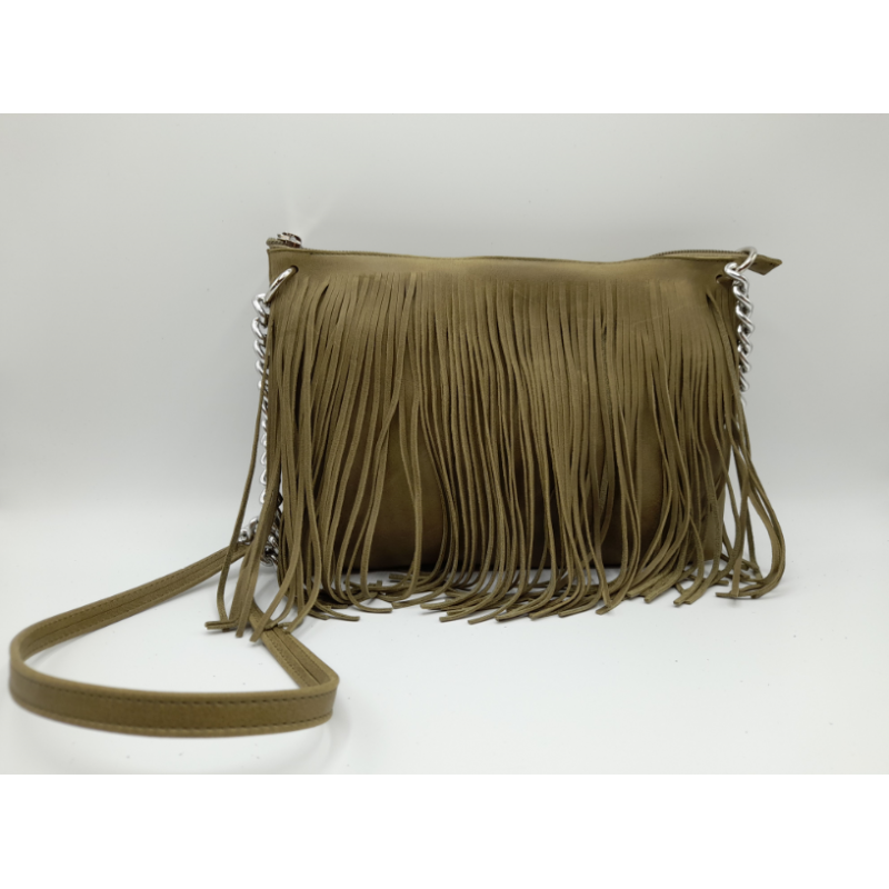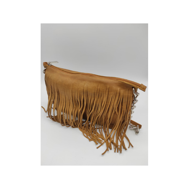 Pratica borsa in vera pelle con frange e tracolla in metallo e pelle.