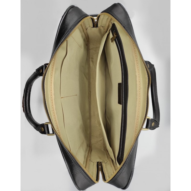 Elegante cartella in vera pelle di vitello tamponata a mano, chiusura con zip e tracolla regolabile. All'interno due scomparti e tasche con zip.