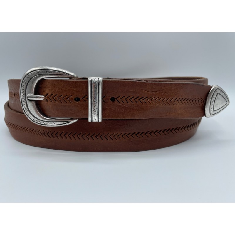 La fibbia in metallo color argento anticato, finemente incisa in stile western, insieme al passante coordinato e alla punta decorata, dona un carattere unico e autentico.