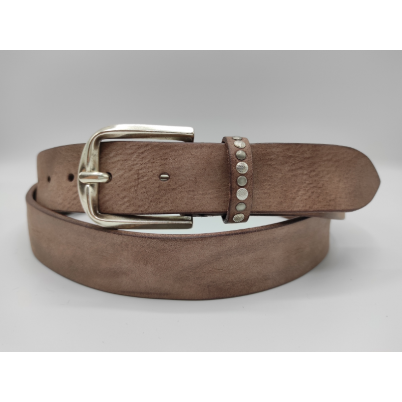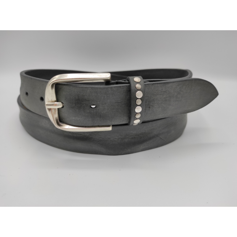 Cintura uomo moda in vero quoio alaska. Sul passante sono applicate borchie in stile invecchiato. Fibbia in metallo, colore argento invecchiato.