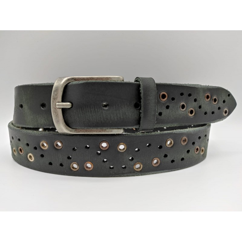 Cintura moda sportiva in vera pelle perforata Used-Look e ochielli multicolor inseritia a mano. Fibbia in metallo colore nikel antico.