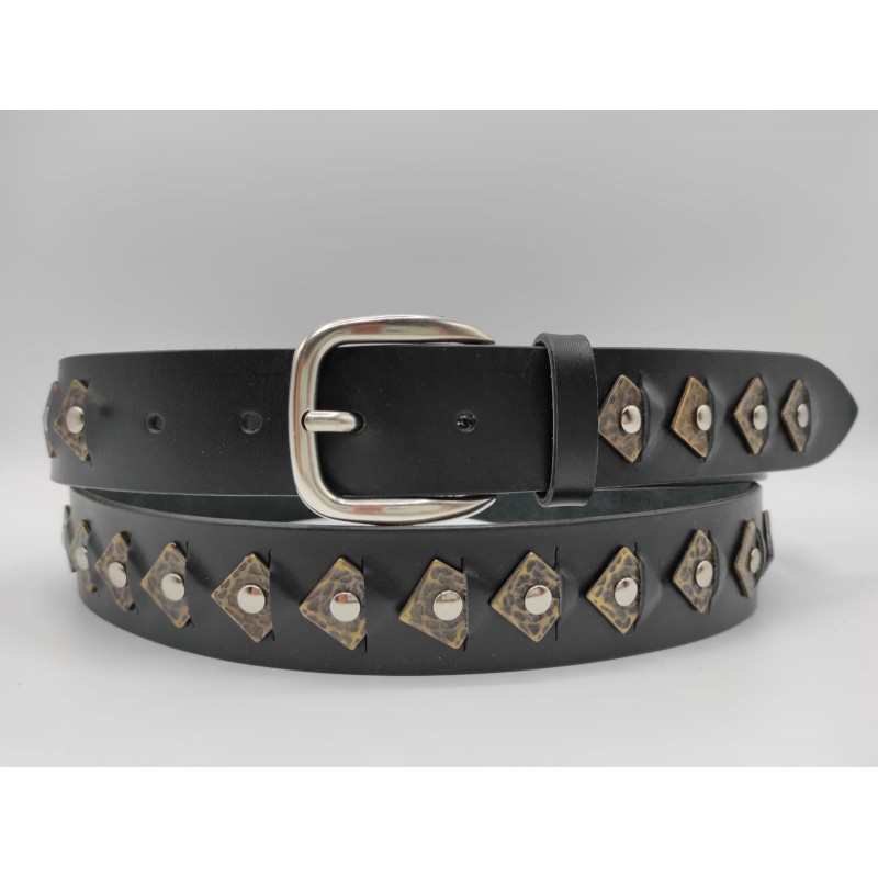 Cintura stile biker in vera pelle, con piastrine in metallo fissate con rivetti. Fibbia in metallo colore argento.
