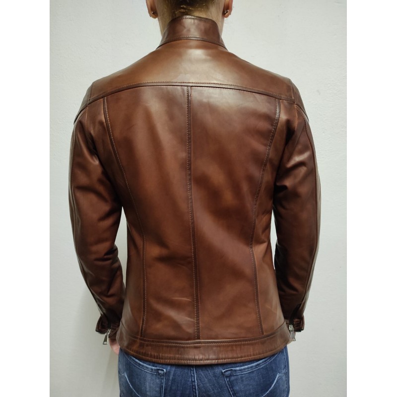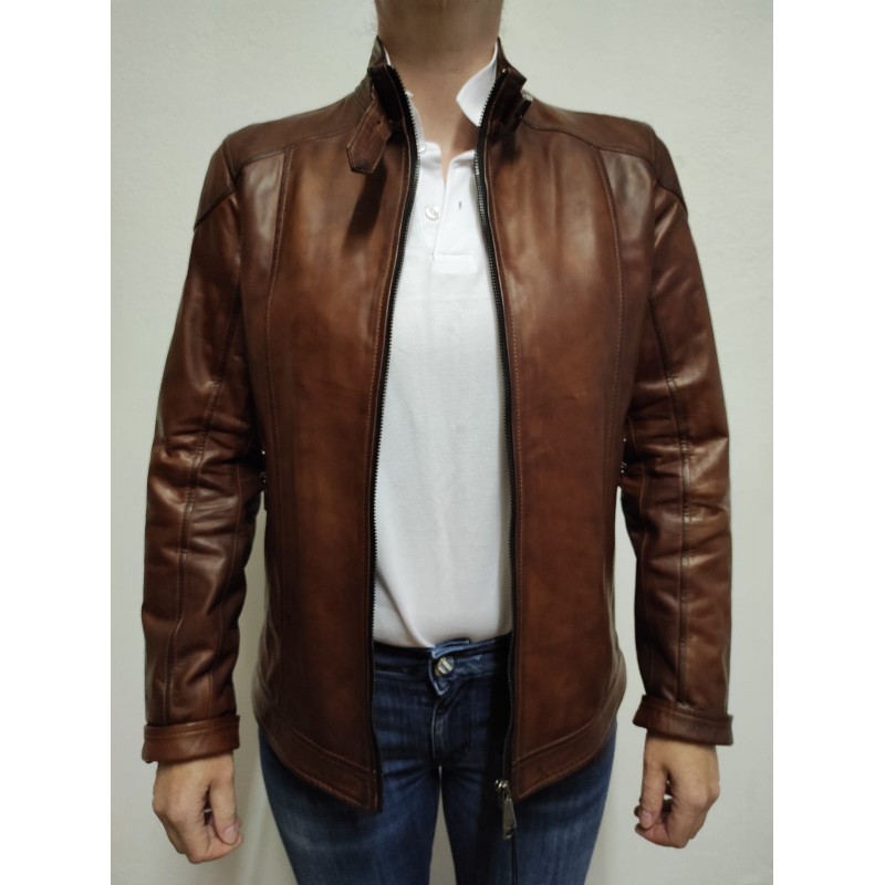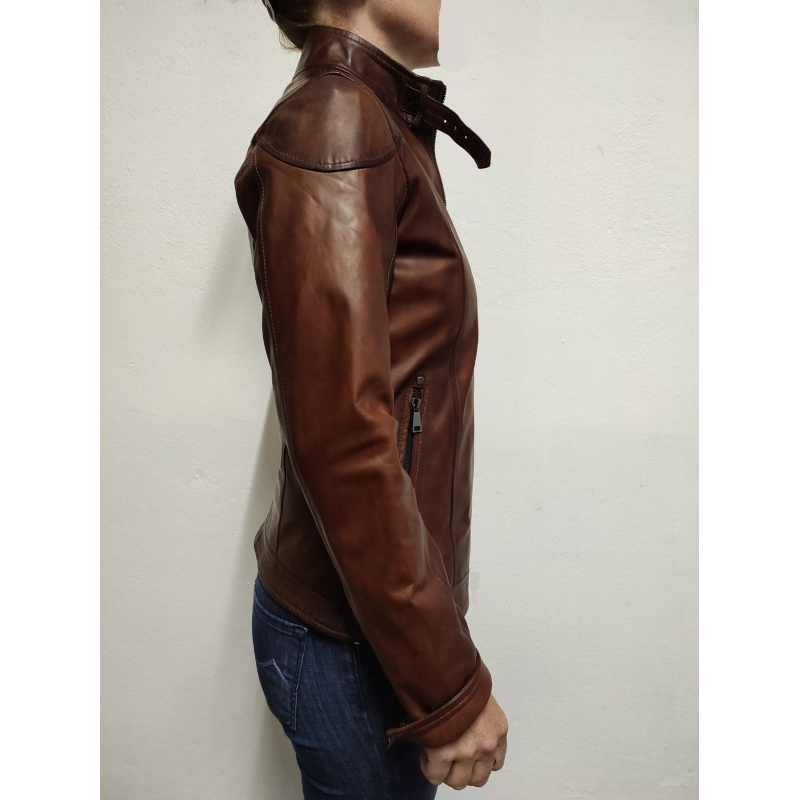 Giacca da donna in vera pelle di agnello, collo con chiusura a ghiera, cerniera a doppio cursore, leggermente più lunga delle giacche tradizionali, tamponata a mano, fodera in viscosa, tasca interna e due tasche esterne.