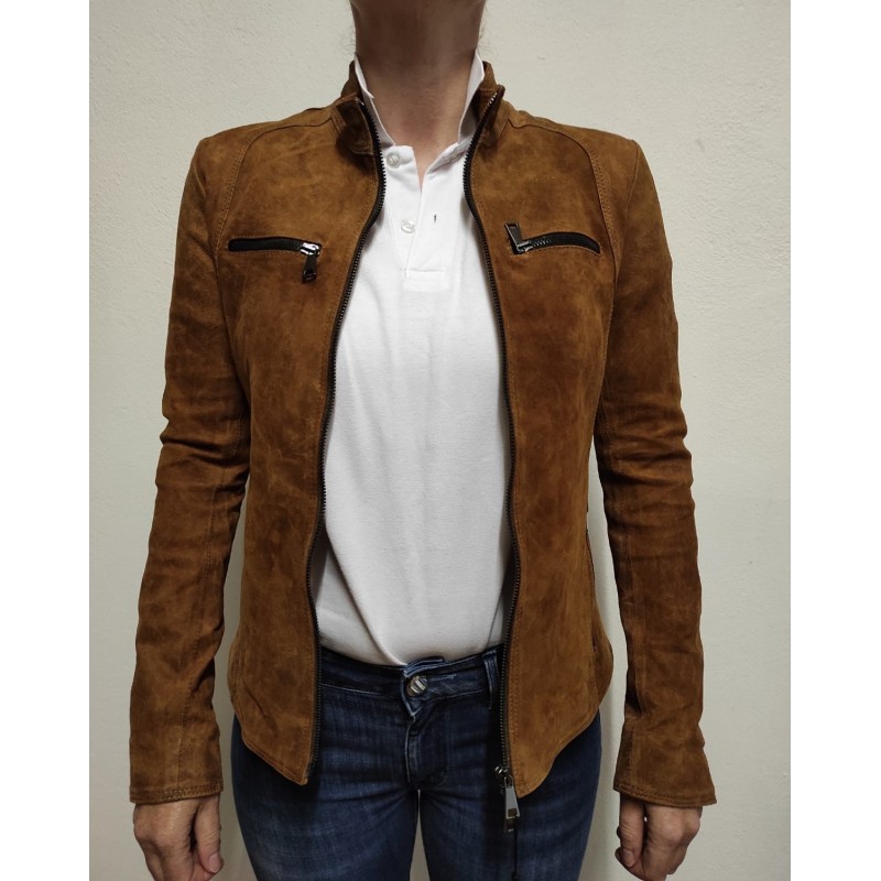 Giacca da donna in vera pelle di agnello con superficie strutturata in ottica scamosciata.
